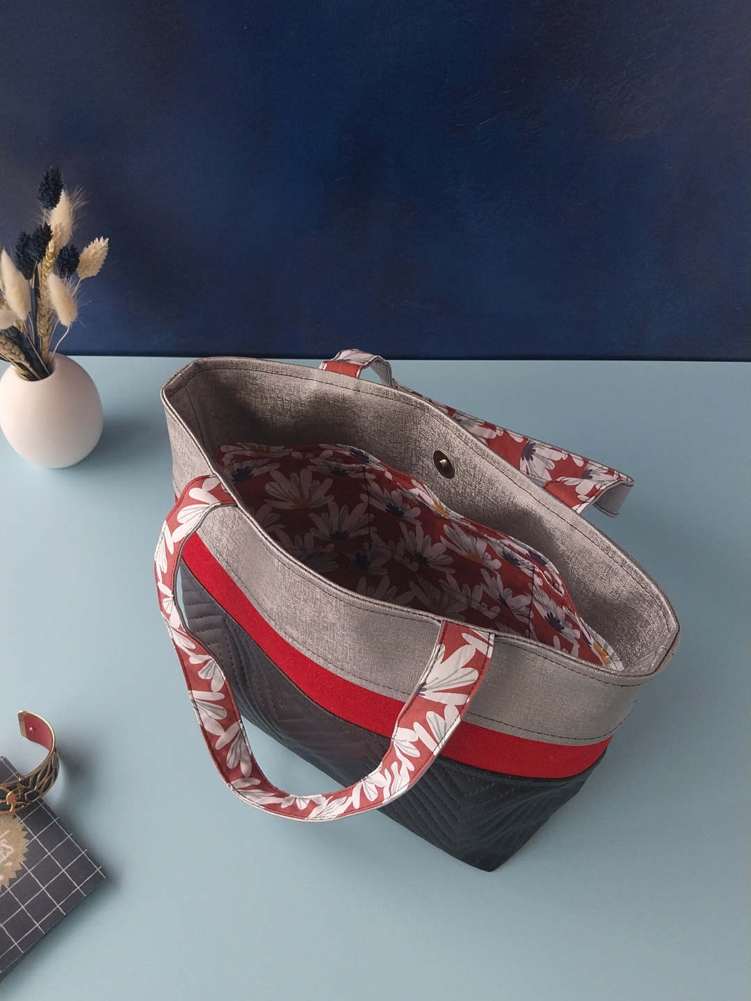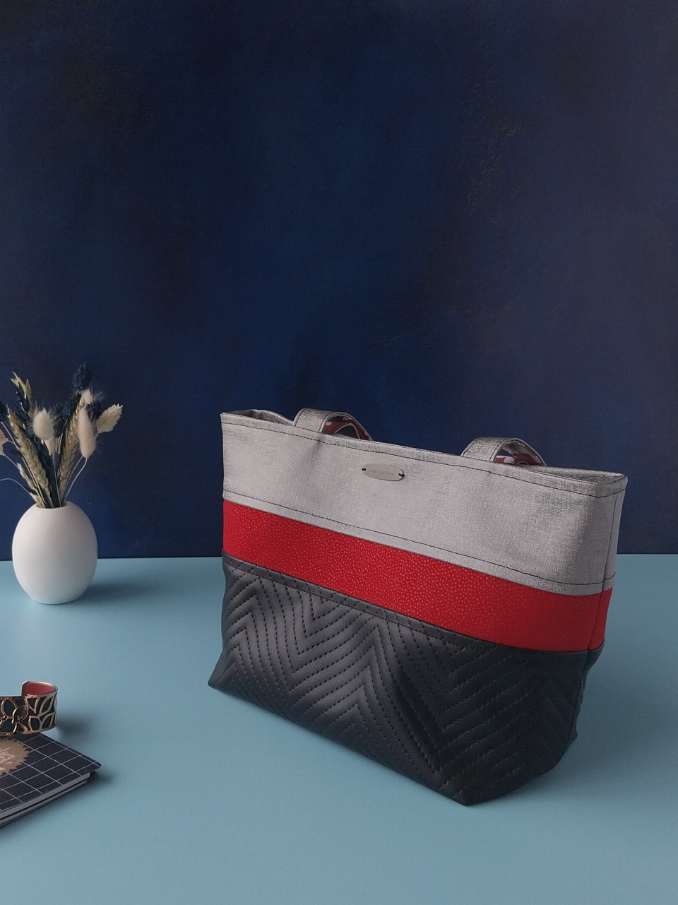 L’extérieur du sac est composé de différents tissus synthétique imitant le cuir. Le noir a un effet matelassé, le rouge a un touché velours et le gris argenté est marbré. Les différentes textures lui donne tout son style.