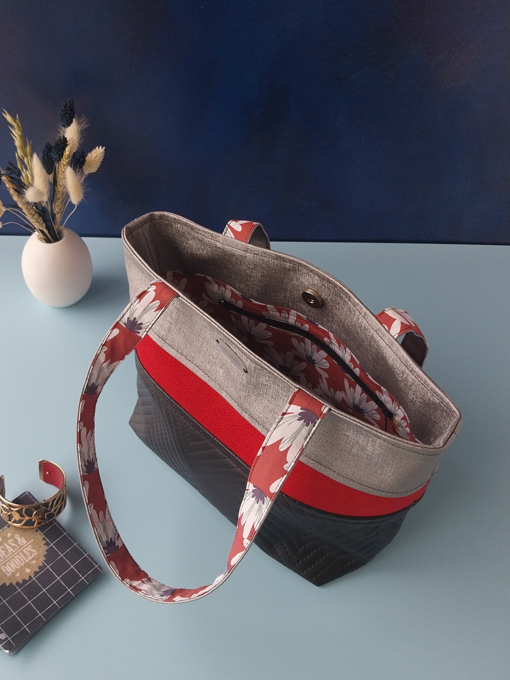 Il se ferme par une pression aimanté, et les anses permettent de le porter à l’épaule. A l’intérieur vous trouverez une poche zippée ainsi qu’un grande poche plaquée de trois compartiments vous permettant de ranger vos indispensables à porter de main.